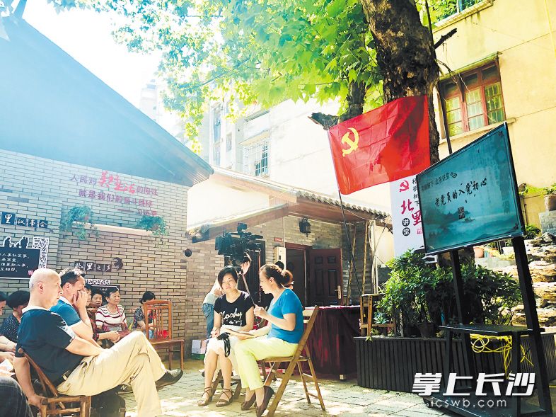 长沙首条历史步道西园北里的百年法梧树下,老党员和年轻党员、街坊们围坐,分享入党的初心故事,上了一堂生动的情景党课。 李卓 摄