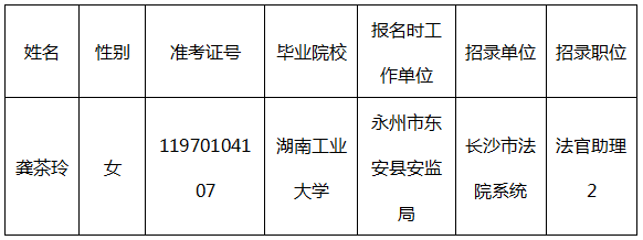 根据中共湖南省委组织部、湖南省人力资源和社会保障厅、湖南省公务员局《湖南省2016年考试录用公务员公告》和《长沙市2016年考试录用公务员体检工作实施意见》的要求,2016年报考长沙市法院系统法官助理2职位的考生龚茶玲,因2016年公务员集中录用时怀孕,未完成体检,暂缓公示、录用。现龚茶玲已完成全部体检项目,结果合格,拟补录,现予以公示。如对公示人选有异议,请于公示期内提出,过期不予受理。