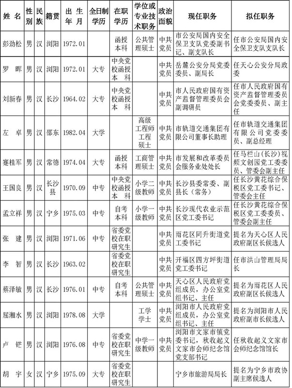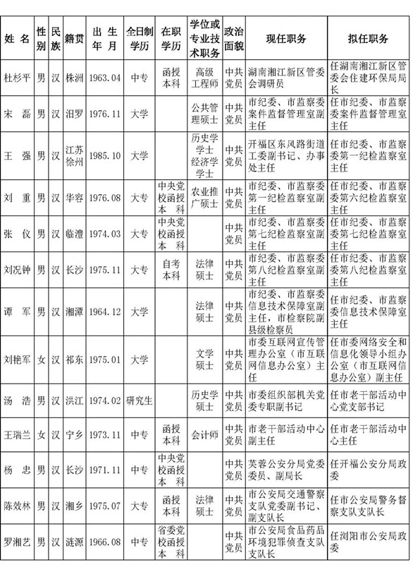 中共长沙市委管理干部任前公示