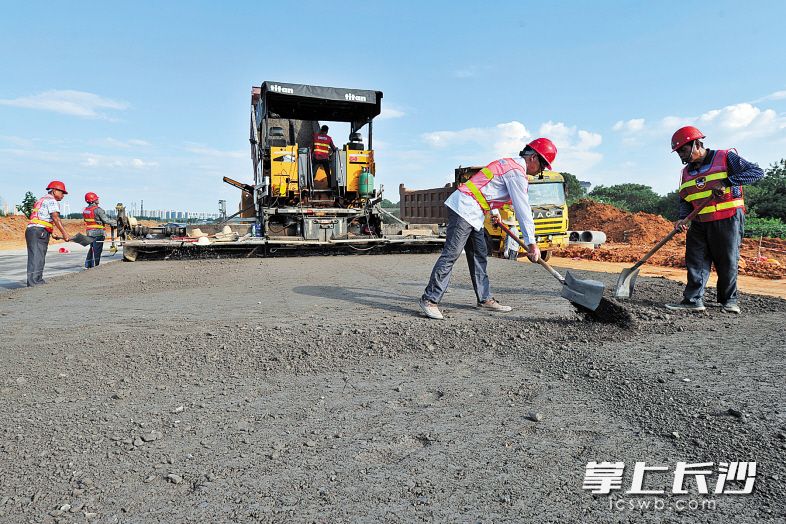 昨日上午,潇湘北路和银星路交会处,施工人员使用大型机械摊铺路面水稳层